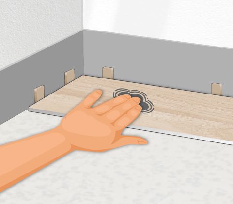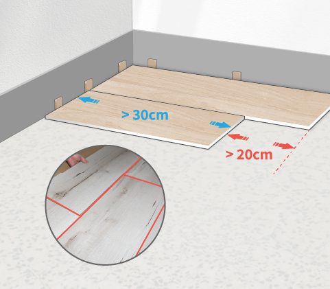 優先從房間角落開始鋪設,將單片地板陽凹槽靠在牆上,將地板的短邊靠在牆上,並用薄墊片將地板和牆壁或其他固定物之間留出約8mm的預留伸縮縫。