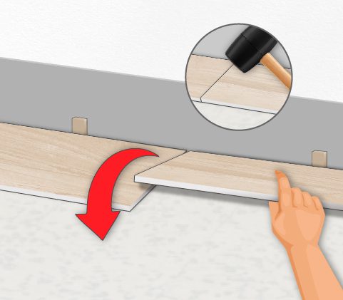 將第二片地板短邊的陰凹槽以45~60度角插入先前安裝的地板短邊端部的陽凹槽中,注意邊緣連接後,輕輕按壓使其緊固,用橡膠錘將兩片地板敲平。