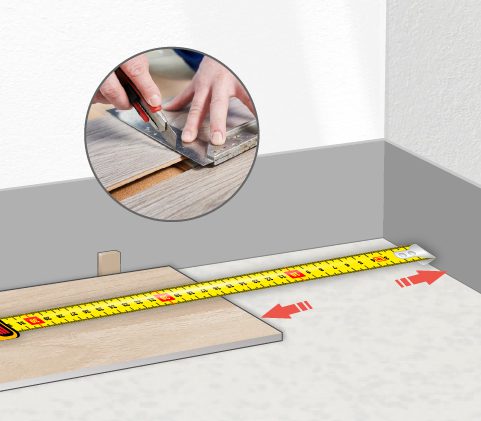 如果最後一塊距離不夠安裝整個地板的長度,使用鋼尺和美工切割出合適的長度來安装。