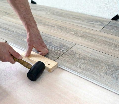 每排地板安裝好,可以墊一塊小地板用橡膠槌敲緊前一片地板,確保兩片地板長邊之間鎖緊沒有縫隙。