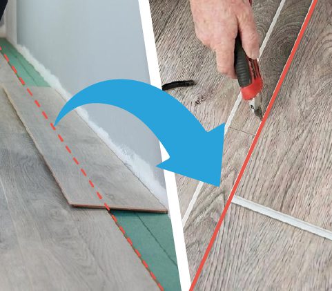 安裝遇到管道、門窗、通風口相接處,首先將板材切割出需要的長度,將地板切割並標記好需要特別切割的形狀和位置。注意接觸的邊緣依樣預留8mm的伸縮縫距離。